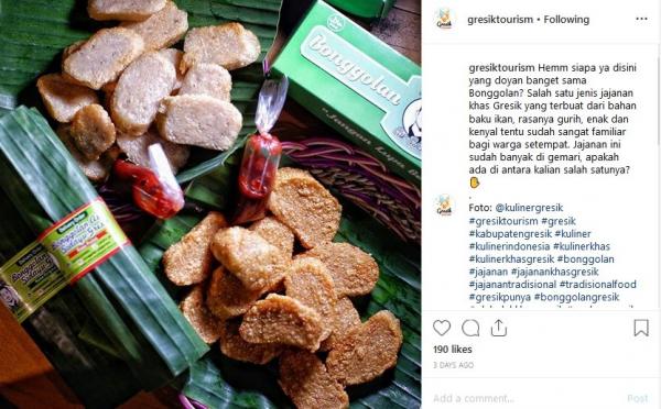 "Hemm, siapa ya di sini yang doyan banget sama Bonggolan? Salah satu jenis jajanan khas Gresik yang terbuat dari bahan baku ikan. Rasanya gurih, enak dan kenyal. Tentu sudah sangat familiar bagi warga setempat. Jajanan ini sudah banyak di gemari. Apakah ada di antara kalian salah satunya?" tulis Instagram @Gresiktourism, dikutip Kamis (23/5/2019).