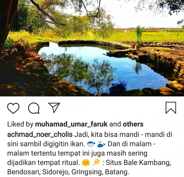 Jadi, kita bisa mandi - mandi di sini sambil digigitin ikan. Dan di malam - malam tertentu tempat ini juga masih sering dijadikan tempat ritual. Situs Bale Kambang, Bendosari, Sidorejo, Gringsing, Batang," tulis Instagram @chmad_noer_cholis, dikutip Selasa (3/11/2019).