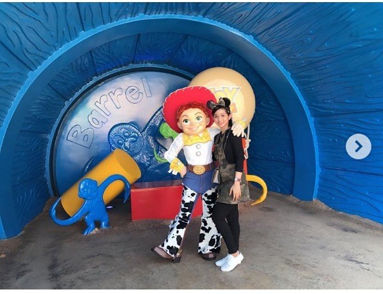 Akhir 2018 lalu, Era Setyowati berkesempatan mengunjungi Hong Kong Disney Land. Di foto ini, Era tampak memadukan all over jeans motif camp dengan atasan dan bawahan serba hitam. Tak lupa ia sematkan aksesori berupa bando berbentuk kuping Minnie Mouse, untuk mempemanis tampilannya. Lucu banget!