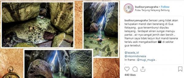"Sensasi yang tidak akan terlupakan mandi dan berenang di Gua Kelayang, gua tersembunyi di Pulau Kelayang, terdapat aliran sungai menuju pantai, airnya sangat jernih dan bersih. Namun saya tidak terjun ikut mandi karena terlalu asyik mengabadikan foto di sekitar gua tersebut," tulis Instagram @budisuryanugraha, Kamis (4/4/2019).