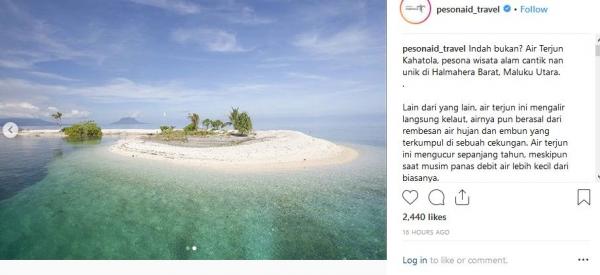 "Indah bukan? Air Terjun Kahatola, pesona wisata alam cantik nan unik di Halmahera Barat, Maluku Utara. Lain dari yang lain, air terjun ini mengalir langsung ke laut, airnya pun berasal dari rembesan air hujan dan embun yang terkumpul di sebuah cekungan. Air terjun ini mengucur sepanjang tahun, meskipun saat musim panas debit air lebih kecil dari biasanya. Posisi air terjun yang mengaliri tebing tinggi diapit pepohonan hijau juga membuatnya terlihat lebih indah. Untuk menemukan keindahan ini, kita perlu menggunakan spead boat kurang lebih sekitar tiga jam dari Pelabuhan Jailolo. Jangan takut bosan, karena sepanjang perjalanan kita akan disuguhkan dengan pemandangan Pulau Halmahera yang indah," tulis Instagram @Pesonaid_Travel dikutip Selasa (11/12/2018).