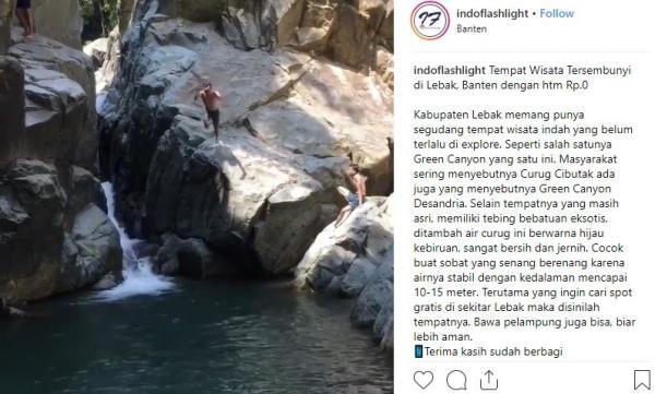 "Tempat wisata tersembunyi di Lebak, Banten dengan htm Rp0. Kabupaten Lebak memang punya segudang tempat wisata indah yang belum terlalu di eksplor. Seperti salah satunya Green Canyon yang satu ini. Masyarakat sering menyebutnya Curug Cibutak ada juga yang menyebutnya Green Canyon Desandria. Selain tempatnya yang masih asri, memiliki tebing bebatuan eksotis, ditambah air curug ini berwarna hijau kebiruan, sangat bersih dan jernih. Cocok buat sobat yang senang berenang karena airnya stabil dengan kedalaman mencapai 10-15 meter. Terutama yang ingin cari spot gratis di sekitar Lebak maka di sinilah tempatnya. Bawa pelampung juga bisa, biar lebih aman. Terima kasih sudah berbagi (@lebakbogacurug)," tulis Instagram @indoflashlight, Selasa (19/3/2019).