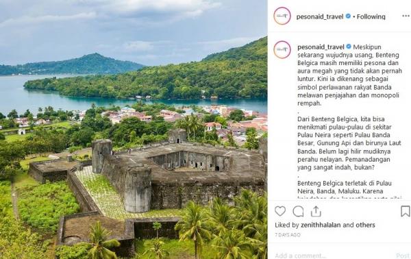 "Meskipun sekarang wujudnya usang, Benteng Belgica masih memiliki pesona dan aura megah yang tidak akan pernah luntur. Kini dikenang sebagai simbol perlawanan rakyat Banda melawan penjajahan dan monopoli rempah. Dari Benteng Belgica, kita bisa menikmati pulau-pulau di sekitar Pulau Neira seperti Pulau Banda Besar, Gunung Api dan birunya Laut Banda. Belum lagi hilir mudiknya perahu nelayan. Pemandangan yang sangat indah, bukan? Benteng Belgica terletak di Pulau Neira, Banda, Maluku. Karena keindahan dan kecantikan, serta nilai sejarah yang sangat tinggi, bangunan benteng Belgica dicalonkan sebagai situs warisan dunia UNESCO sejak 1995. Benteng Belgica juga sering dijuluki The Indonesian Pentagon, lho! Tahu kenapa?," tulis Instagram @pesonaid_travel, dikutip Jumat (22/11/2019).