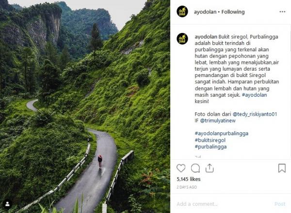 "Bukit Siregol, Purbalingga adalah bukit terindah di Purbalingga yang terkenal akan hutan dengan pepohonan lebat, lembah menakjubkan, dan air terjun yang lumayan deras. Pemandangan di Bukit Siregol sangat indah. Hamparan perbukitan dengan lembah dan hutannya masih sangat sejuk. Ayo dolan ke sini! Foto dolan dari @tedy_riskiyanto01. IF @trimulyatinew," tulis Instagram @ayodolan, dikutip Senin (7/10/2019).