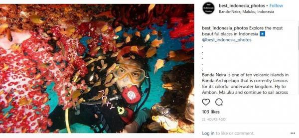 "Banda Neira adalah salah satu dari sepuluh pulau vulkanik di Kepulauan Banda yang saat ini terkenal dengan kerajaan bawah laut yang penuh warna. Terbang ke Ambon, Maluku dan terus berlayar menyeberangi perairan langsung ke pulau ini untuk berenang bersama dengan ratusan ikan cantik yang pasti akan mengherankan Anda. Di sini @g_hanafiah melakukan penyelaman dan menangkap dengan tembakan yang menginspirasi oleh @pinneng! Apakah Anda siap untuk petualangan bawah air?" tulis Instagram @best_indonesia_photos, dikutip iNews.id, Minggu (3/6/2018).
