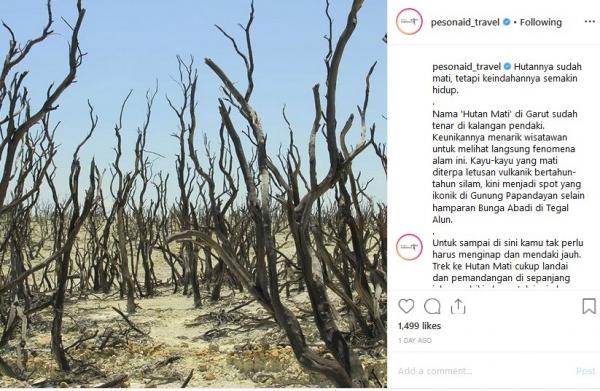 "Hutannya sudah mati, tetapi keindahannya semakin hidup. Nama Hutan Mati di Garut sudah tenar di kalangan pendaki. Keunikannya menarik wisatawan untuk melihat langsung fenomena alam ini. Kayu-kayu yang mati diterpa letusan vulkanik bertahun-tahun silam, kini menjadi spot yang ikonik di Gunung Papandayan, selain hamparan Bunga Abadi di Tegal Alun. Untuk sampai di sini, kamu tak perlu harus menginap dan mendaki jauh. Trek ke Hutan Mati cukup landai dan pemandangan di sepanjang jalannya bikin kamu tak ingin buru-buru sampai. Tertarik menjelajahi Hutan Mati? Yuk, sekalian rencanakan pendakian ke Gunung Papandayan!" tulis Instagram @pesonaid_travel, dikutip Senin (15/4/2019).