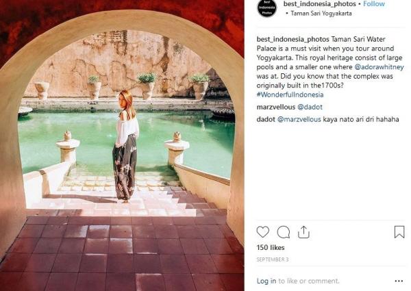 "Istana Air Taman Sari Yogyakarta adalah tempat yang wajib dikunjungi saat berwisata keliling Yogyakarta. Warisan kerajaan ini terdiri dari kolam besar dan yang lebih kecil di mana @adorawhitney berada. Tahukah Anda bahwa kompleks ini awalnya dibangun pada 1700? #WonderfulIndonesia," tulis Instagram @best_indonesia_photos, dikutip Selasa (25/9/2018).
