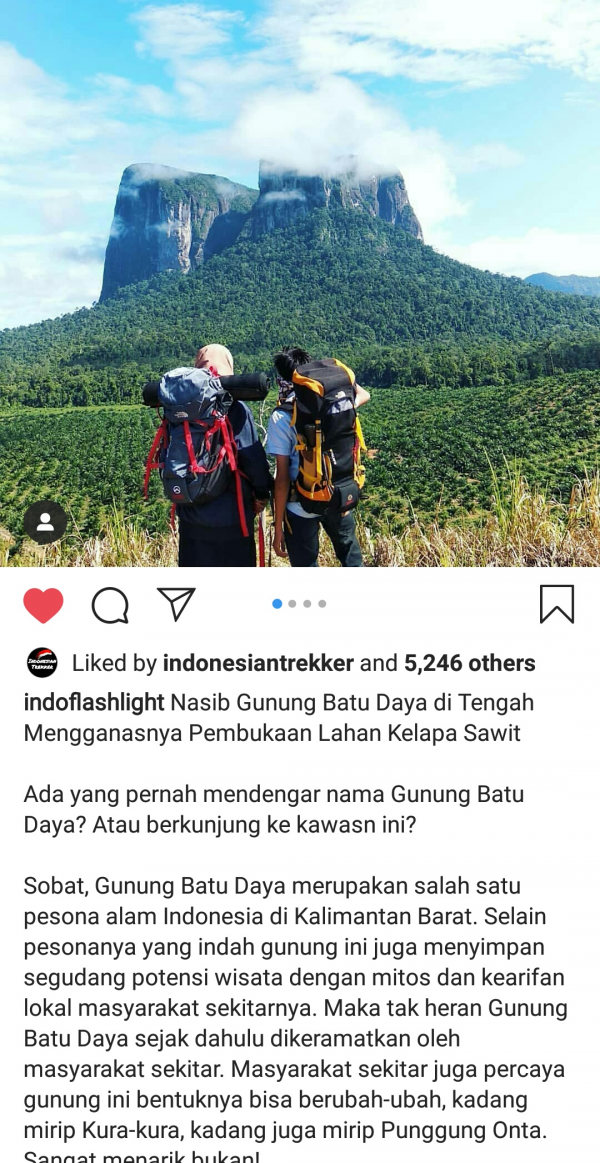 "Nasib Gunung Batu Daya di tengah mengganasnya pembukaan lahan kelapa sawit. Salah satu warga dusun Keranji, Desa Batu Daya mengungkapkan kekhawatirannya akan nasib dan keberadaan Bukit Batu Daya. Menurutnya, nasib Gunung Batu Daya kini sudah semakin terhimpit, juga menangis karena penopang di sisi kiri dan kanan berupa hutan di sekitar bukitnya semakin berkurang, karena pembukaan lahan kelapa sawit oleh beberapa perusahaan yang tak kunjung henti. Referensi foto: @jupita-sf, @adifery79 dan @wisata.batudaya," tulis Instagram @indoflashlight, dikutip Sabtu (13/7/2019).