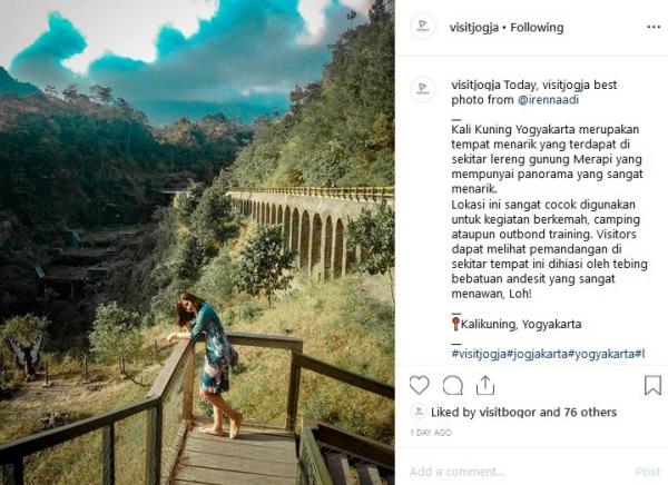 "Kali Kuning Yogyakarta merupakan tempat menarik yang terdapat di sekitar lereng gunung Merapi yang mempunyai panorama yang sangat menarik. Lokasi ini sangat cocok digunakan untuk kegiatan berkemah, camping ataupun outbond training. Visitors dapat melihat pemandangan di sekitar tempat ini dihiasi oleh tebing bebatuan andesit yang sangat menawan, Loh!," tulis Instagram @visitjogja, Jumat (30/8/2019).