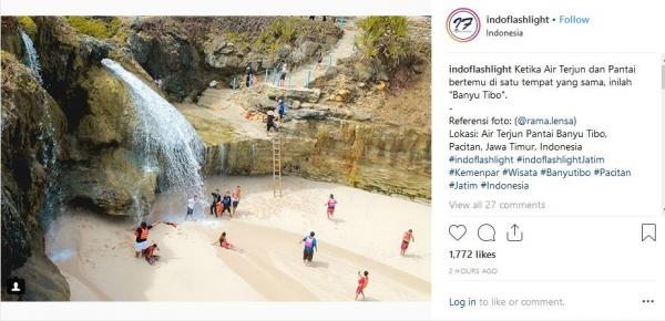 "Ketika air terjun dan pantai bertemu di satu tempat yang sama, inilah Banyu Tibo," tulis Instagram @Indoflashlight, dikutip Minggu (21/10/2018).
