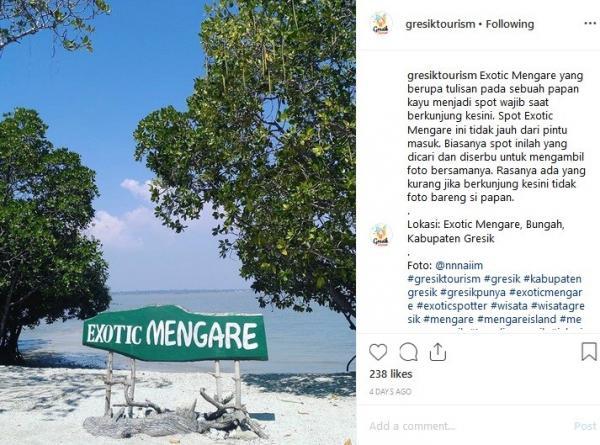 "Exotic Mengare yang berupa tulisan pada sebuah papan kayu menjadi spot wajib saat berkunjung ke sini. Spot Exotic Mengare ini tidak jauh dari pintu masuk. Biasanya, spot inilah yang dicari dan diserbu untuk mengambil foto bersamanya. Rasanya ada yang kurang jika berkunjung ke sini tidak foto bareng si papan," tulis Instagram @Gresiktourism, dikutip Kamis (23/5/2019).