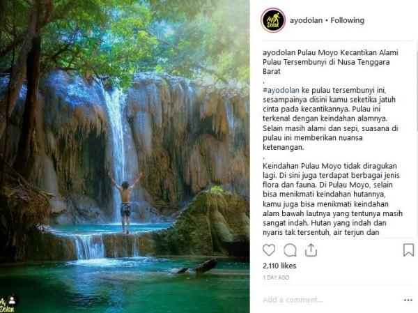 "Pulau Moyo, kecantikan alami pulau tersembunyi di Nusa Tenggara Barat. #ayodolan ke pulau tersembunyi ini, sesampainya di sini kamu seketika jatuh cinta pada kecantikannya. Pulau ini terkenal dengan keindahan alamnya. Selain masih alami dan sepi, suasana di pulau ini memberikan nuansa ketenangan. Keindahan Pulau Moyo tidak diragukan lagi. Di sini juga terdapat berbagai jenis flora dan fauna. Di Pulau Moyo, selain bisa menikmati keindahan hutannya, kamu juga bisa menikmati keindahan alam bawah lautnya yang tentunya masih sangat indah. Hutan yang indah dan nyaris tak tersentuh, air terjun dan sungai-sungai alami, serta keindahan bawah laut. Yuk tag dan ajak teman kamu dolan ke sini! Foto dolan dari @zeebimbimm @fatannuari," tulis Instagram @ayodolan, dikutip Sabtu (9/2/2019).