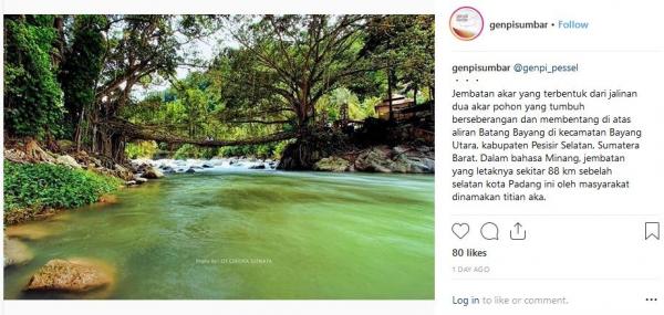 "Jembatan akar yang terbentuk dari jalinan dua akar pohon yang tumbuh berseberangan dan membentang di atas aliran Batang Bayang di Kecamatan Bayang Utara, Kabupaten Pesisir Selatan, Sumatera Barat. Dalam bahasa Minang, jembatan yang letaknya sekitar 88 km sebelah selatan kota Padang ini oleh masyarakat dinamakan titian aka. Jembatan ini memiliki panjang 25 meter dan lebar 1,5 meter dengan ketinggian dari permukaan sungai sekitar 10 meter, mulai dibentuk pada 1890 dan baru dapat digunakan pada 1916. Dengan kata lain, proses merajut akar menjadi jembatan ini membutuhkan waktu lebih kurang 26 tahun. Saat ini, kondisinya semakin lama semakin kuat karena semakin besarnya akar pohon beringin yang membentuknya," tulis Instagram @GenpiSumbar dikutip Jumat (19/10/2018).