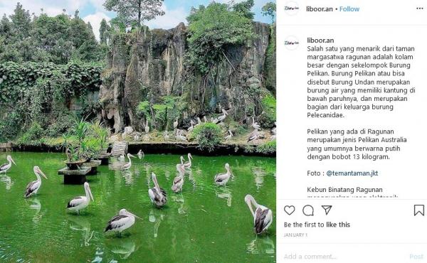 "Salah satu yang menarik dari taman margasatwa ragunan adalah kolam besar dengan sekelompok Burung Pelikan. Burung Pelikan atau bisa disebut Burung Undan merupakan burung air yang memiliki kantung di bawah paruhnya, dan merupakan bagian dari keluarga burung Pelecanidae. Pelikan yang ada di Ragunan merupakan jenis Pelikan Australia yang umumnya berwarna putih dengan bobot 13 kilogram. Foto: @temantaman.jkt," tulis Instagram @liboor.an, dikutip Rabu (11/3/2020).