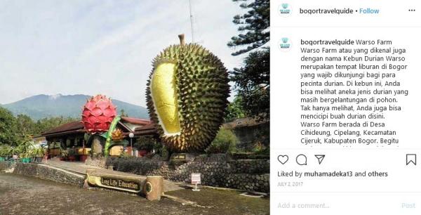 "Warso Farm atau yang dikenal juga dengan nama Kebun Durian Warso merupakan tempat liburan di Bogor yang wajib dikunjungi bagi para pencinta durian. Di kebun ini, Anda bisa melihat aneka jenis durian yang masih bergelantungan di pohon. Tak hanya melihat, Anda juga bisa mencicipi buah durian di sini," tulis Instagram @bogortravelguide, dikutip Senin (10/2/2020).