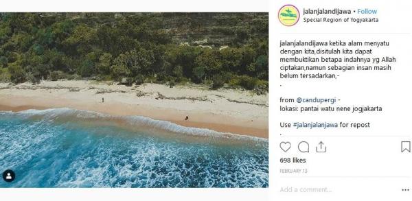 "Ketika alam menyatu dengan kita, di situlah kita dapat membuktikan betapa indahnya yang Allah ciptakan. Namun, sebagian insan masih belum tersadarkan," tulis Instagram @jalanjalandijawa, dikutip Senin (4/3/2019).
