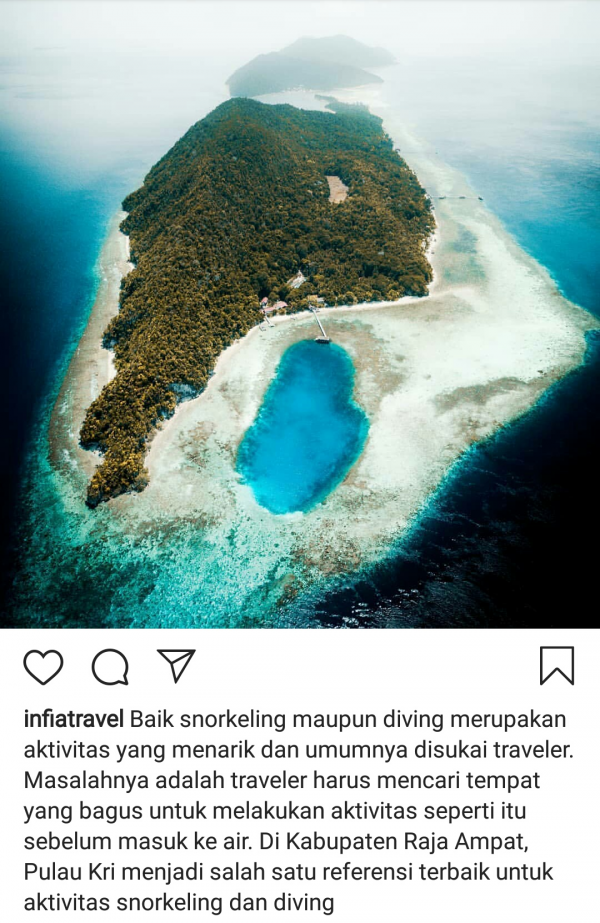 "Baik snorkeling maupun diving merupakan aktivitas yang menarik dan umumnya disukai traveler. Masalahnya adalah traveler harus mencari tempat yang bagus untuk melakukan aktivitas seperti itu sebelum masuk ke air. Di Kabupaten Raja Ampat, Pulau Kri menjadi salah satu referensi terbaik untuk aktivitas snorkeling dan diving. Lokasinya berada di Distrik Meos Mansar dan memiliki beragam karang dan banyak ikan yang berwarna-warni, semuanya itu layak untuk ditelusuri. Belum lagi air menawarkan visibilitas top-notch dan gelombang laut moderat. Kri terletak di dekat Pulau Mansuar, sehingga memiliki keindahan dan atraksi yang sama. Pada umumnya, traveler akan mengunjungi kedua pulau selama perjalanan mereka," tulis Instagram @infiatravel dikutip Selasa (3/12/2019).
