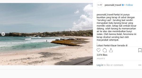 "Pantai ini punya keunikan yang kerap di sebut dengan Seruling Laut. Seruling laut sendiri merupakan batu karang besar yang memiliki celah. Setiap kali ombak besar datang, celah karang itu memancarkan air ke atas dan menimbulkan bunyi siulan. Oleh karena itulah, fenomena ini kerap disebut seruling laut oleh masyarakat setempat. Lokasi Pantai Klayar berada di Kecamatan Donorojo, atau sekitar 45 km dari pusat Kota Pacitan. Uniknya lagi, di pantai ini juga terdapat karang raksasa yang berbentuk mirip patung Sphinx di Mesir, lho. Sangat bagus untuk dijadikan background foto kalian. Pacitan juga dikenal sebagai kota 1.001 Gua di Jawa Timur," tulis Instagram @Pesonaid_travel dikutip Senin (21/1/2019).