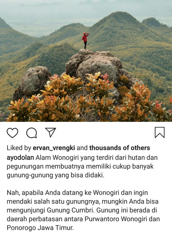 "Alam Wonogiri yang terdiri dari hutan dan pegunungan membuatnya memiliki cukup banyak gunung-gunung yang bisa didaki. Nah, apabila Anda datang ke Wonogiri dan ingin mendaki salah satu gunungnya, mungkin Anda bisa mengunjungi Gunung Cumbri. Gunung ini berada di daerah perbatasan antara Purwantoro Wonogiri Jawa Tengah dan Ponorogo Jawa Timur," tulis Instagram @ayodolan, dikutip Jumat (19/12/2019).