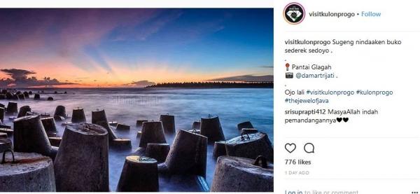 Pantai Glagah merupakan primadona di Kulonprogo. Di pantai ini traveler dapat bermain perahu kano di laguna, naik motorcross di hamparan pasir besi dan memancing di atas tetrapod yang berfungsi sebagai pemecah ombak. Bahkan Anda juga dapat memetik buah naga di agrowisata.