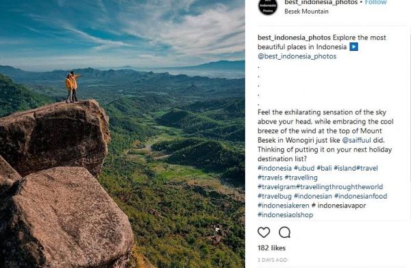 "Rasakan sensasi yang menggembirakan dari langit di atas kepala Anda, sambil merasakan angin sejuk di puncak Gunung Besek, Wonogiri seperti halnya @saiffuul. Berpikir untuk meletakkan gunung ini menjadi daftar tujuan liburan Anda selanjutnya," tulis @best_indonesia_photos, dikutip Senin (11/6/2018).