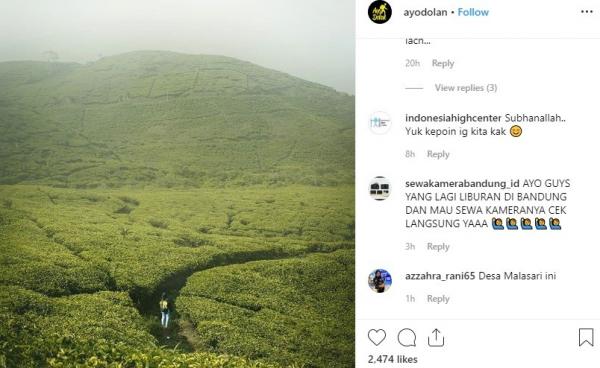 "Menikmati sensasi berdingin-dingin di kawasan Perkebunan Teh Nirmala Agung, Bogor. #ayodolan ke sini, menikmati hamparan hijau daun teh yang luas, terlihat eksotis saat sore datang. Selain itu, di kawasan tersebut juga terdapat beberapa air terjun dan sungai. Wah pemandangan yang pas bukan? Foto dolan dari @den_zones Inframe * @lilaaalilut," tulis Instagram @ayodolan, Jumat (31/5/2019).