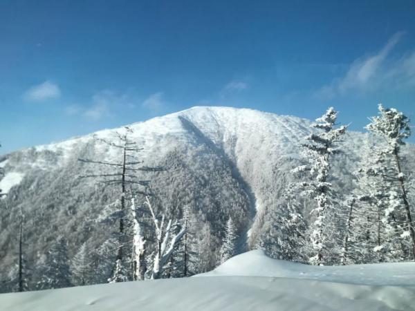 Setelah menaiki puluhan anak tangga, kami sampai di titik pantau pemandangan indah Kampung Salju Xuexiang dengan latar belakang bukit-bukti dan pohon pinus berlapis salju tebal. Meski sinar matahari tidak terlihat sempurna, semburat cahayanya tetap tampak indah. Sesekali muncul bentuk setengah lingkaran berwarna kuning, sedikit merah dan biru.