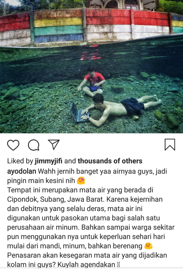 "Wahh jernih banget yaa airnya guys, jadi pingin main ke sini nih. Tempat ini merupakan mata air yang berada di Cipondok, Subang, Jawa Barat. Karena kejernihan dan debitnya yang selalu deras, mata air ini digunakan untuk pasokan utama bagi salah satu perusahaan air minum. Bahkan sampai warga sekitar pun menggunakan nya untuk keperluan sehari hari mulai dari mandi, minum, bahkan berenang. Penasaran akan kesegaran mata air yang dijadikan kolam ini guys? Kuylah agendakan. Foto dolan dari @sdverdana," tulis Instagram @ayodolan dikutip Minggu (22/3/2020).
