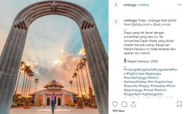 "Siapa yang tak kenal dengan universitas yang satu ini. Ya! Universitas Gadjah Mada yang dicita-citakan banyak orang. Bangunan masjid kampus ini tidak terlepas dari sejarah loh, vistors!" tulis Instagram @Visitjogja, Selasa (11/6/2019).