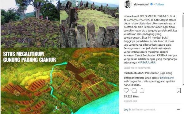 "Situs Megalitikum Dunia di Gunung Padang Kab Cianjur tahun depan akan ditata dan dikonservasi secara profesional oleh Pemprov Jabar, agar tidak semakin rusak atau terganggu oleh aktivitas wisatawan dan pedagang yang sembarangan. Situs ini menjadi bukti tingginya peradaban Sunda Kuno di masa lalu yang harus dilestarikan secara baik. Semoga akan menjadi destinasi sejarah yang tertata secara maksimal seperti kawasan Candi Borobudur. Karena bangsa yang besar adalah bangsa yang menghargai sejarahnya. #JABARJUARA," tulis Instagram @RidwanKamil, dikutip Rabu (31/10/2018).