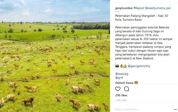 "Peternakan peninggalan kolonial Belanda yang berada di kaki Gunung Sago ini dibangun pada 1916, dulu peternakan seluas lk. 300 hektare ini sempat menjadi peternakan terbesar di Asia Tenggara, hamparan padang rumput yang hijau dan subur dengan ribuan sapi-sapi yang berkeliaran mengingatkan kita akan peternakan-peternakan di New Zealand," tulis Instagram @westsumatra_ssci, dikutip iNews.id, Selasa (5/6/2018).
