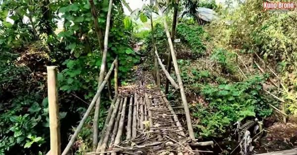 Dalam perjalanannya menuju ke situs yang berada di tengah-tengah sawah tersebut, Kuno Brono melewati pepohonan di kebun jeruk. Kemudian, menyeberangi jembatan bambu berada di atas sungai yang mengalir deras usai hujan.