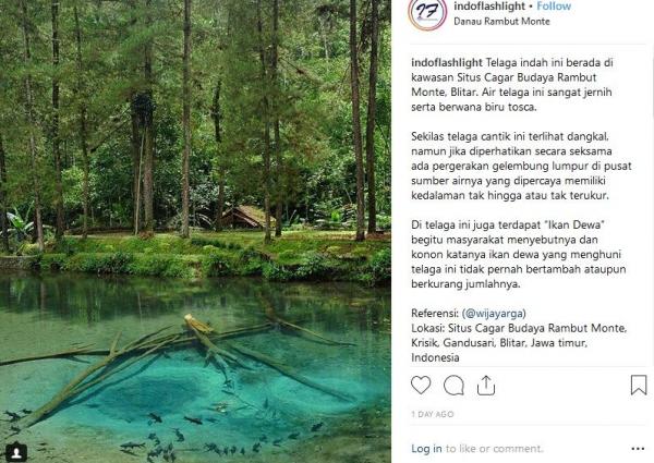 "Telaga indah ini berada di kawasan Situs Cagar Budaya Rambut Monte, Blitar. Air telaga ini sangat jernih serta berwana biru toska. Sekilas telaga cantik ini terlihat dangkal, namun jika diperhatikan secara seksama ada pergerakan gelembung lumpur di pusat sumber airnya yang dipercaya memiliki kedalaman tak hingga atau tak terukur. Di telaga ini juga terdapat ikan dewa begitu masyarakat menyebutnya dan konon katanya ikan dewa yang menghuni telaga ini tidak pernah bertambah ataupun berkurang jumlahnya," tulis Instagram @Indoflashlight, dikutip Kamis (29/11/2018).