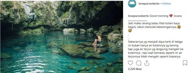 "Jadi males renang kalau lihat kolam kaya begini, takut menodai kebeningannya. Sebenarnya yang menjadi daya tarik di telaga ini bukan hanya air kolamnya yang bening tapi juga air terjun yang langsung mengalir ke kolamnya, tapi saat kemarau seperti ini air terjunnya tidak mengalir seperti biasanya. Jangan tertipu dengan beningnya kolam yg membuatnya seperti dangkal karena kedalaman kolam antara 2-6 m," tulis Instagram LovePurwokerto, Jumat (26/10/2018).