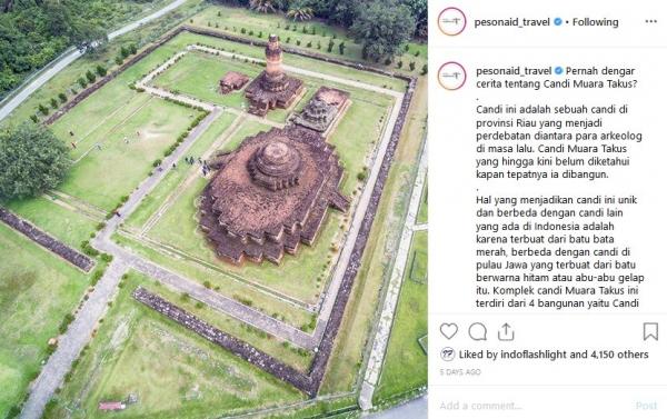 "Candi Muara Takus terletak di Kecamatan XIII Koto Kampar, Kabupaten Kampar, Riau. Jaraknya dari kota Pekanbaru sekitar 135 km. Candi ini terletak di dekat Sungai Kampar Kanan. Sobat pesona yang ingin liburan ke Riau, jangan lewatkan berkunjung ke sini ya!" tulis Instagram @Pesonaid_travel, dikutip Rabu (19/6/2019).