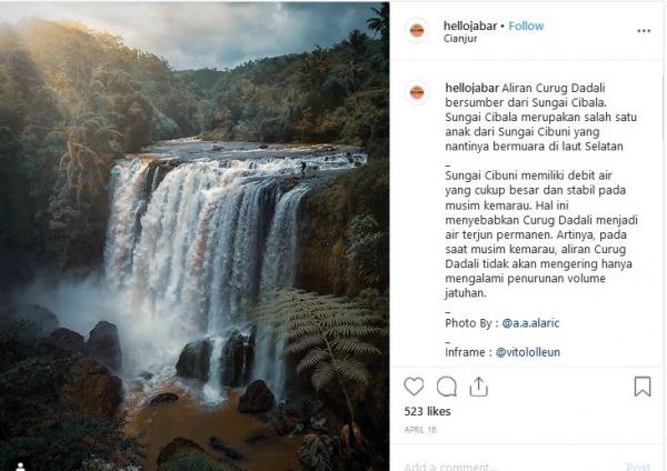 "Aliran Curug Dadali bersumber dari Sungai Cibala. Sungai Cibala merupakan salah satu anak dari Sungai Cibuni yang nantinya bermuara di laut Selatan. Sungai Cibuni memiliki debit air yang cukup besar dan stabil pada musim kemarau. Hal ini menyebabkan Curug Dadali menjadi air terjun permanen. Artinya, pada saat musim kemarau, aliran Curug Dadali tidak akan mengering hanya mengalami penurunan volume jatuhan," tulis Instagram @hellojabar dikutip Kamis (3/10/2019).