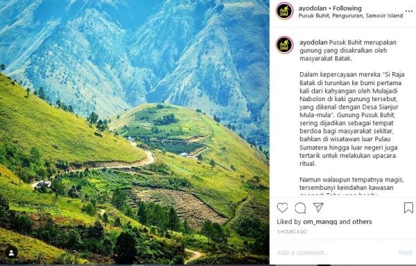 "Pusuk Buhit merupakan gunung yang disakralkan oleh masyarakat Batak. Dalam kepercayaan mereka 'Si Raja Batak di turunkan ke bumi pertama kali dari kahyangan oleh Mulajadi Nabolon di kaki gunung tersebut, yang dikenal dengan Desa Sianjur Mula-mula. Gunung Pusuk Buhit, sering dijadikan sebagai tempat berdoa bagi masyarakat sekitar, bahkan wisatawan luar Pulau Sumatera hingga luar negeri juga tertarik untuk melakukan upacara ritual. Namun walaupun tempatnya magis, tersembunyi keindahan kawasan geopark Toba yang begitu memukau," tulis Instagram @ayodolan, dikutip Kamis (26/12/2019).