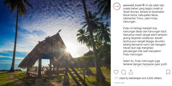 "Ini dia salah satu wisata bahari yang begitu indah di Tanah Borneo. Berada di Kecamatan Biduk-biduk, Kabupaten Berau, Kalimantan Timur, yakni Pulau Kaniungan," tulis Instagram @Pesonaid_travel, dikutip Senin (2/9/2019).