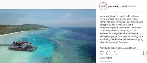 "Ternyata di Kepulauan Derawan tidak hanya terkenal dengan keindahan pantainya saja. Tapi di sana juga terdapat danau-danau unik yang menyimpan pesona tersendiri. Keindahan dan kekayaan biota laut yang ada di kawasan ini menjadikan Pulau Derawan sebagai surganya para pencinta diving dan snorkeling. Bahkan banyak satwa unik yang bisa kita jumpai di Derawan," tulis Instagram @Pesonaid_ Travel, Kamis (27/12/2018).