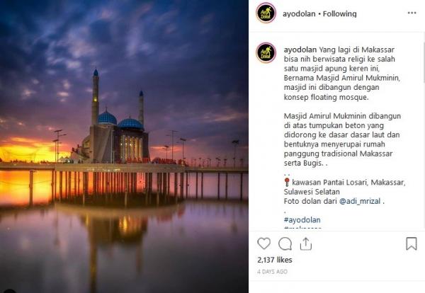 "Yang lagi di Makassar bisa nih berwisata religi ke salah satu masjid apung keren ini. Bernama Masjid Amirul Mukminin, masjid ini dibangun dengan konsep floating mosque. Masjid Amirul Mukminin dibangun di atas tumpukan beton yang didorong ke dasar dasar laut dan bentuknya menyerupai rumah panggung tradisional Makassar serta Bugis. Kawasan Pantai Losari, Makassar, Sulawesi Selatan. Foto dolan dari @adi_mrizal," tulis Instagram @ayodolan dikutip Rabu (13/11/2019).