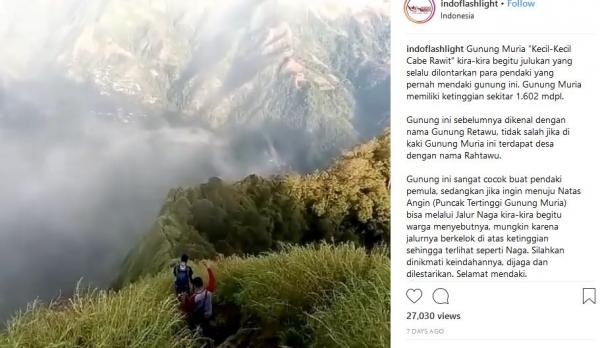 "Gunung Muria 'Kecil-Kecil Cabai Rawit' kira-kira begitu julukan yang selalu dilontarkan para pendaki yang pernah mendaki gunung ini. Gunung Muria memiliki ketinggian sekitar 1.602 mdpl. Gunung ini sebelumnya dikenal dengan nama Gunung Retawu, tidak salah jika di kaki Gunung Muria ini terdapat desa dengan nama Rahtawu," tulis Instagram @indoflashlight dikutip Rabu (25/7/2018).