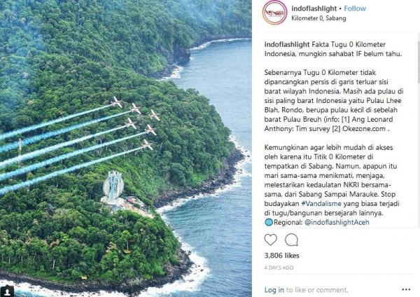 "Fakta Tugu 0 Kilometer Indonesia, mungkin sahabat IF belum tahu. Sebenarnya Tugu 0 Kilometer tidak dipancangkan persis di garis terluar sisi barat wilayah Indonesia. Masih ada pulau di sisi paling barat Indonesia yaitu Pulau Lhee Blah, Rondo, berupa pulau kecil di sebelah barat Pulau Breuh. Kemungkinan agar lebih mudah di akses, oleh karena itu Titik 0 Kilometer di tempatkan di Sabang. Namun, apa pun itu mari sama-sama menikmati, menjaga, melestarikan kedaulatan NKRI bersama-sama, dari Sabang sampai Marauke. Stop budayakan #Vandalisme yang biasa terjadi di tugu/bangunan bersejarah lainnya," tulis Instagram @indoflashlight, dikutip Sabtu (21/7/2018).