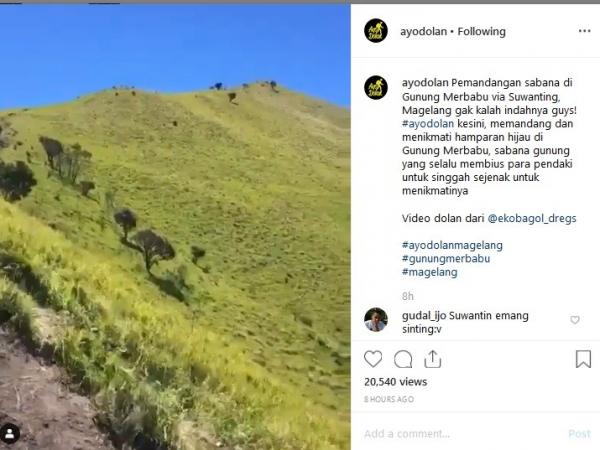 "Pemandangan sabana di Gunung Merbabu via Suwanting, Magelang gak kalah indahnya guys! #ayodolan ke sini, memandang dan menikmati hamparan hijau di Gunung Merbabu, sabana gunung yang selalu membius para pendaki untuk singgah sejenak untuk menikmatinya. Video dolan dari @ekobagol_dregs," tulis Instagram @ayodolan, dikutip Selasa (10/9/2019).