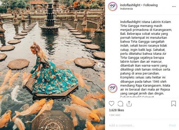 "Beberapa sobat wisata yang pernah ke tempat ini menuturkan bahwa Tirta Gangga sangatlah indah, sekali ke sini rasanya tidak cukup, ingin balik lagi. Sahabat, perlu diketahui bahwa Istana Air Tirta Gangga sejatinya berupa labirin kolam dan air mancur, ditambah ikan warna-warni yang dikelilingi oleh taman rimbun serta patung di area percandian. Kompleks seluas satu hektare ini dibangun pada 1946 oleh mendiang Raja Karangasem. Mata air ini berasal dari mata air Rejasa yang sangat jernih dan dingin. Sobat tertarik? Selamat mengunjungi tempat indah ini," tulis Instagram @Indoflashlight, dikutip Senin (13/5/2019).