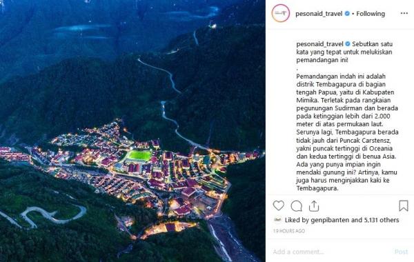 "Tembagapura punya tata kota yang sangat baik, topografi alam dan perbukitan nan indah berkelok-kelok yang terlihat begitu menawan. Suhu udaranya dingin. Sepanjang hari kita bisa merasakan kabut atau awan yang memberi kesan seolah-olah sedang berada di negeri atas awan. Dan yang tak kalah menarik, kita bisa melihat pusat pertambangan yang besar di sini, tapi izin dulu ya!" tulis Instagram @pesonaid_travel, dikutip Jumat (10/5/2019).