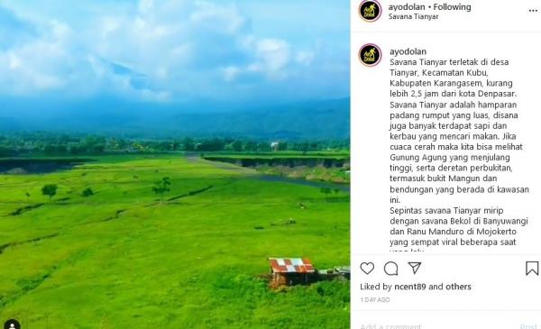 "Savana Tianyar adalah hamparan padang rumput yang luas. Di sana juga banyak terdapat sapi dan kerbau yang mencari makan. Jika cuaca cerah maka kita bisa melihat Gunung Agung yang menjulang tinggi, serta deretan perbukitan, termasuk bukit Mangun dan bendungan yang berada di kawasan ini. Sepintas savana Tianyar mirip dengan savana Bekol di Banyuwangi dan Ranu Manduro di Mojokerto yang sempat viral beberapa saat yang lalu. Video dolan dari @aryawiznu," tulis Instagram @ayodolan dikutip Senin (16/3/2020).