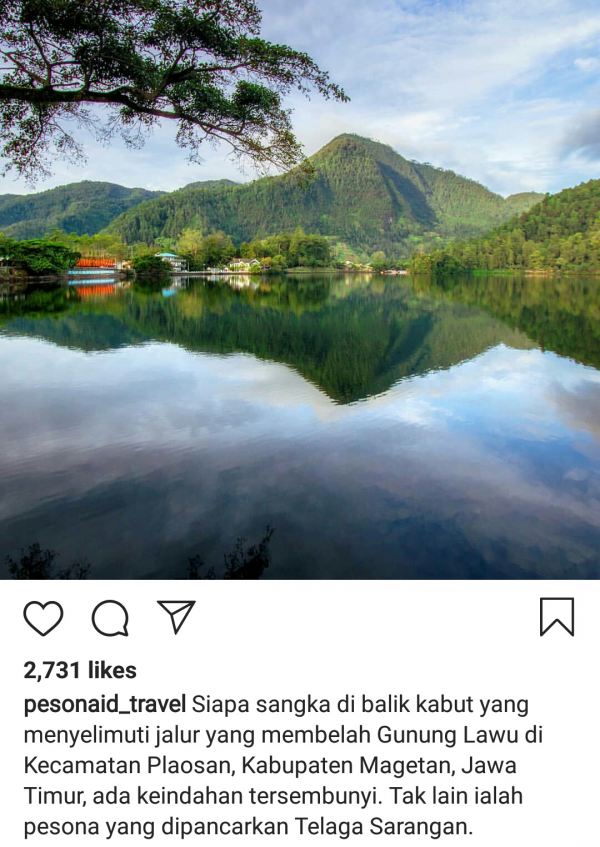 "Siapa sangka di balik kabut menyelimuti jalur yang membelah Gunung Lawu di Kecamatan Plaosan, Kabupaten Magetan, Jawa Timur, ada keindahan tersembunyi. Tak lain ialah pesona yang dipancarkan Telaga Sarangan. Hamparan air nan tenang ini disebut Telaga Sarangan dan dikenal juga sebagai Telaga Pasir. Lokasinya berada di ketinggian 1.200 meter di atas permukaan laut, tepatnya di Lereng Gunung Lawu, Plaosan. Tak hanya menikmati pemandangan indah ditemani udara dingin. Sobat Pesona juga bisa bermain mengelilingi telaga pakai speedboat yang disewakan, menunggangi kuda, atau menikmati beragam jajanan tradisional yang banyak dijajakan di sekitar Telaga Sarangan. Takut kemalaman? Tenang, di sini banyak tersedia penginapan seperti hotel atau villa. Liburan bersama keluarga bisa jadi pilihan yang tepat nih, Sobat! yuk, ajak keluarga tercinta menikmati indahnya Telaga Sarangan," tulis Instagram @Pesonaid_travel, dikutip Kamis (29/8/2019).