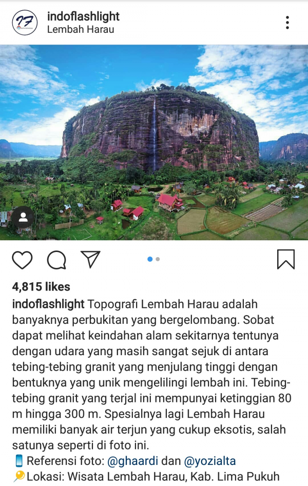 "Topografi Lembah Harau berbukit dan bergelombang. Anda dapat melihat keindahan alam di sekitarnya. Udaranya sejuk. Tebing-tebing granit yang menjulang tinggi dengan bentuk yang unik mengelilingi lembah ini. Tebing-tebing granit yang terjal ini mempunyai ketinggian 80 m hingga 300 m. Spesialnya lagi, Lembah Harau memiliki banyak air terjun yang cukup eksotis, salah satunya seperti di foto ini. Referensi foto: @ghaardi dan @yozialta," tulis @indoflashlight, dikutip Sabtu (13/7/2019).