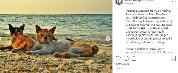 "Unik! Ternyata Pulau Kucing ada di Indonesia. Jika sebelumnya sobat ketahui bahwa Pulau Kucing ada di Jepang, di Indonesia juga ada Pulau Kucing. Pulau ini bernama Pulau Dea-Dea atau lebih familiar dengan nama Pulau Kucing. Jadi sobat tidak perlu jauh-jauh ke Pulau Tashiro di Jepang jika ingin ke Cats Island, karena di Indonesia juga ada. Semoga tempat indah ini semakin lestari," tulis Instagram @Indoflashlight, Senin (5/8/2019).