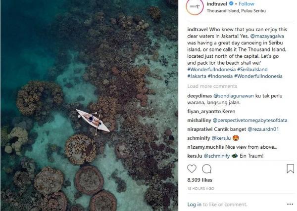 "Siapa tahu Anda dapat menikmati perairan jernih ini di Jakarta! Ya, @mazayagalva sedang menikmati kano di Pulau Seribu yang terletak di utara ibu kota. Mari kita pergi dan berkemas untuk melihat pantai? #WonderfulIndonesia #SeribuIsland #Jakarta #Indonesia #WonderfulIndonesia," tulis Instagram @indtravel dikutip Minggu (26/8/2018).